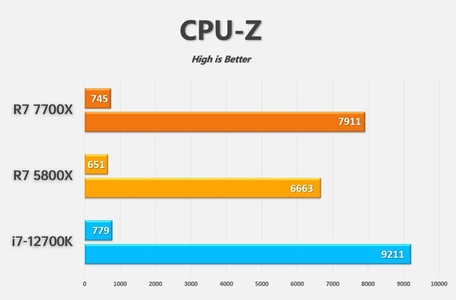CPU-Z成绩,7700X的单核相比5800X提升了15%,多核成绩提升了19%。提升幅度没有锐龙3000→锐龙5000(27% /23%)的幅度大。