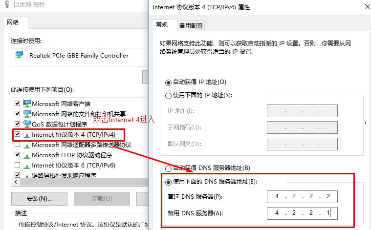 1、打开网络和共享中心——将DNS服务器地址修改为:4.2.2.2或是4.2.2.1。