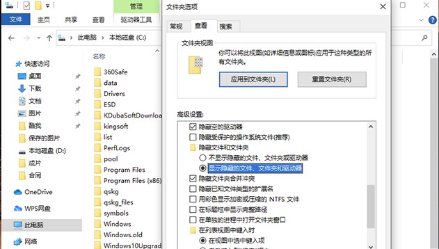 打开C盘,点击上方的“查看”栏目,点击“选项”,在文件夹选项中,切换至“查看”选项卡,将隐藏受保护的操作系统文件(推荐)选项的勾选去掉,并且点击选择“显示隐藏的文件、文件夹和驱动器”选项,即可查看系统隐藏的文件和文件夹。