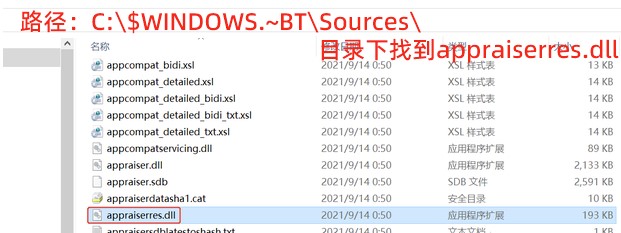 在C盘的根目录下,依次打开文件夹$WINDOWS.~BT\Sources\,删除appraiserres.dll文件。具体路径:C:\$WINDOWS.~BT\Sources\appraiserres.dll,如果没有说明系统没有更新到最新,或者缺少系统补丁。如果删除appraiserres.dll文件,再次检测更新时依然会被新文件覆盖,可以新建一个相同命名的文本文件,将扩展名也要改为dll,右键该文件选择属性,并设置为只读。