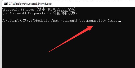 3、随后在其中输入“bcdedit /set {current} bootmenupolicy legacy”回车运行。