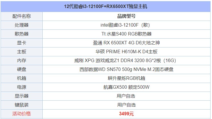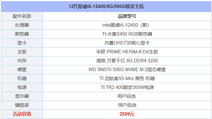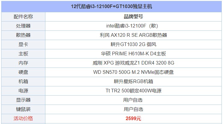 别看是酷睿i3,由intel于每一代的迭代升级,12代i3 12100性能相当不错了,主要用于替代i5 10400,两者性能各有千秋,得益于10纳米工艺架构,i3 12100F相比上一代i5 10400F在单核性能上强了41%,多线程仅落后6%左右。适合要求稍高的普通家用或者企业办公使用,没有轻量级游戏需求,本套配置就对了,如果还有一些轻量级游戏需求,可以看看R5 5600G核显APU主机。