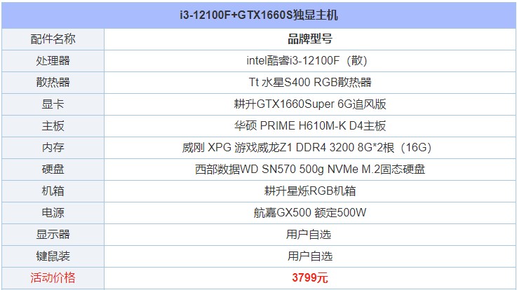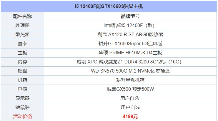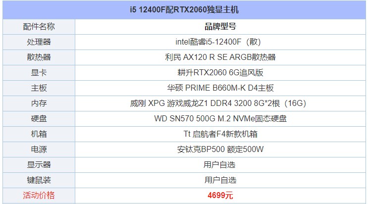 考虑到不少小伙伴对CPU要求偏高,偏爱i5,所以将CPU提升至i5 12400F,将散热器也进一步提升,显卡依然保留为GTX1660S,适合1080P中、高画质玩各种3A游戏。