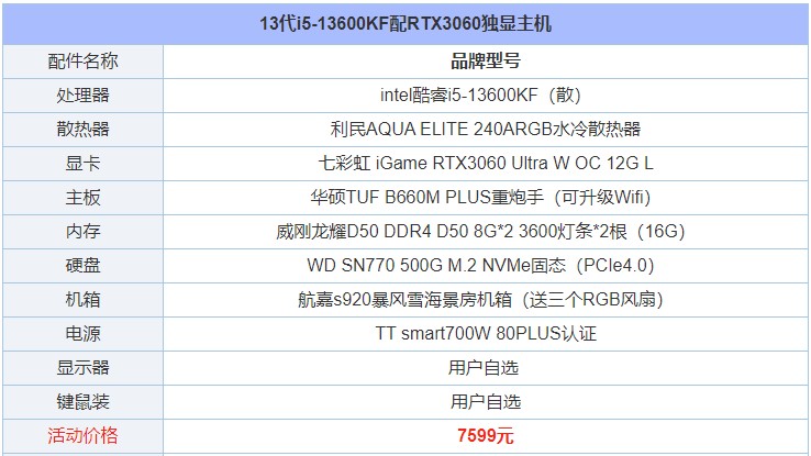 独显配置9:13代i5-13600KF配RTX3060Ti独显主机