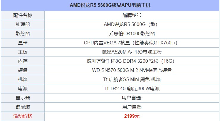 对于不想上独显,还想玩一些轻量级网游的,可以考虑一下AMD锐龙R5 5600G这套配置,近期降价了不少,性价比更为出众。R5 5600G拥有六核心十二线程设计,其性能对位的是i5 11600K,不过在多线程性能领先不少,对于多任务处理、生产力会有比较不错的表现。R5 5600G最大的优势其实在于核显性能较强,其内置的Vega 7 GPU核显性能基本相当于GTX750Ti显卡,也就是意味着,畅玩腾讯全家桶,在1080P中或高画质下畅玩英雄联盟、守望先锋、穿越火线、CSGO、DNF、DOTA等轻量级网络游戏完全没问题。不过对于单机大作来说,依然是无法满足,毕竟是核显,作为网游利器完全没有问题。
