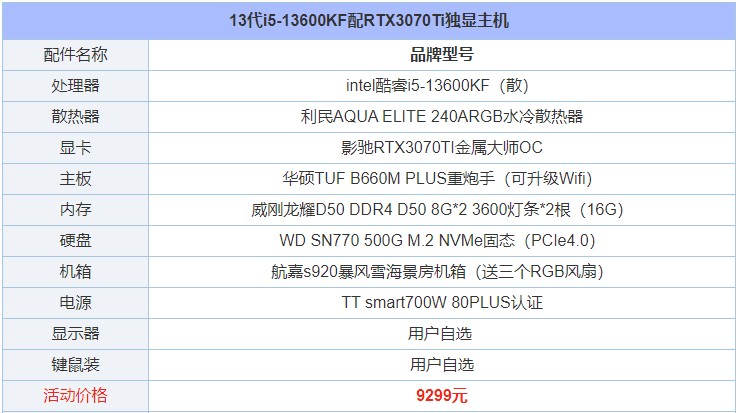 独显配置10:13代i5-13600KF配RTX3070Ti独显主机