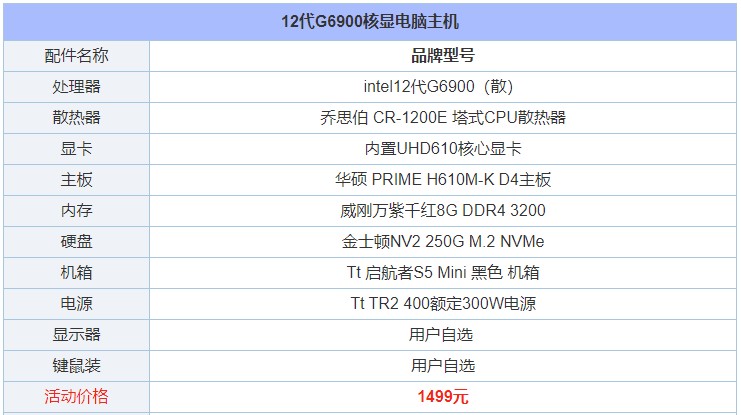 这套是全新的intel第12代赛扬入门级配置方案,赛扬G6900的性能综合性能领先AMD家的速龙200GE、速龙3000G,满足日常家用、商务办公、娱乐影音、上网课、炒股等需求,适合公司办公机采购人群,或者对配置要求不高的家用人群。如果对CPU性能需求更高,这套配置还可以升级为12代奔腾G7400。
