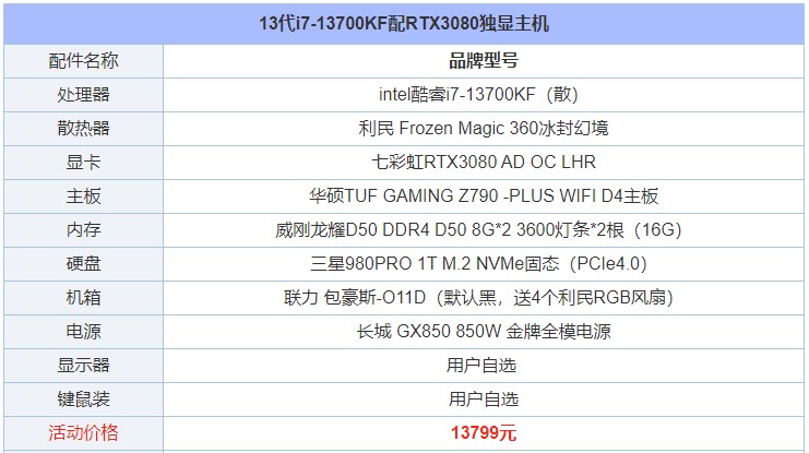 独显配置12:13代i7-13700KF配RTX3080独显主机