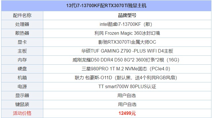 独显配置11:13代i7-13700KF配RTX3070Ti独显主机