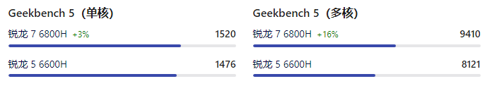 R7 6800H的geekbench5的单核跑分是1520,而R5 6600H是1476,多核一个是9410,一个是8121,总体而言R7 6800H的多核表现很不错。