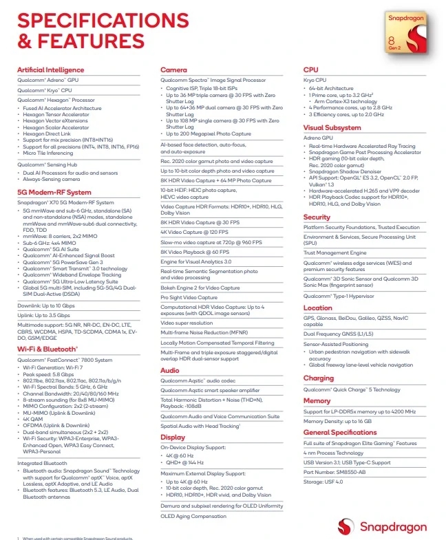 骁龙 8 Gen 2 升级到了新的骁龙 X70 调制解调器,同时支持毫米波和 sub 6GHz 的 5G 网络。其峰值下行速度为 10Gbps,峰值上行速度为 3.5Gbps(与前代相似)。