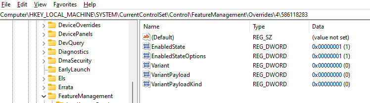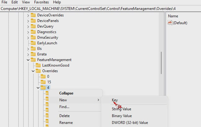 2、依次打开到HKEY_LOCAL_MACHINE\SYSTEM\CurrentControlSet\Control\FeatureManagement\Overrides\4