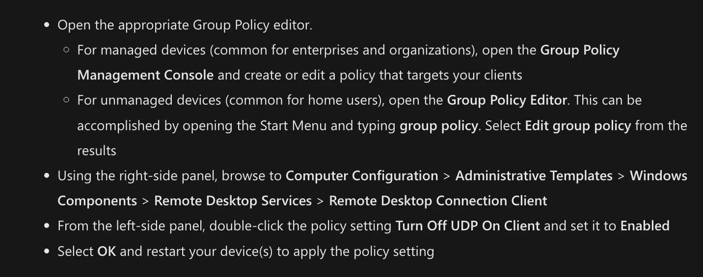 近日,微软确认,目前Win11 22H2中存在远程桌面停止响应问题,微软承诺,将会在后续的“Moment”更新中,修复这一问题,确保用户的使用体验,详细请看下文介绍。 Win11 Version 22H2 于数月前正式发布,引入了很多值得注意的改进。此外微软还承诺后续通过“Moment”更新方式,为 22H2 用户带来更多新功能。 除了新功能之外,微软还承诺在未来更新中会修复 Win11 22H2 中存在的一个现有问题:通过远程桌面网关(Remote Desktop gateway)或远程桌面连接代理( Remote Desktop Connection Broker)连接时,Windows 远程桌面应用程序(Windows Remote Desktop)会停止响应。 我们了解到,微软表示这个问题对家庭用户的影响并不是很大。微软承认这个问题主要发生在“加载虚拟机”或者“配置远程连接”步骤时,而且无论远程计算机上安装的是什么操作系统版本,都可能发生。在某些情况下,用户会收到“你的远程桌面服务会话已经结束”的提醒。 如果你收到上述错误信息,你可以从任务管理器中终止该任务。你也可以通过配置一个特殊的组策略来解决这个问题。微软建议在更新发布修复这个问题之后,应该恢复这条组策略的改变。 需要注意的是,配置特殊组策略将禁用所有从设备进行的远程桌面连接的 UDP(用户数据报协议)。在对组策略进行修改后,你可能还会遇到远程桌面会话性能不佳的情况。 |