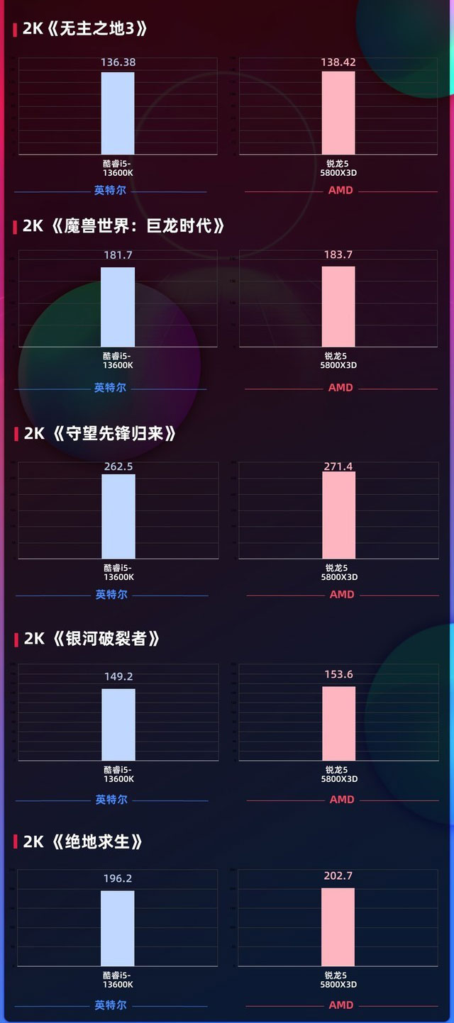 2K分辨率中,AMD锐龙75800X3D更是在这5款游戏中全部胜出,展现出了强大的游戏性能。对于大部分网络游戏而言,确实十分看重处理器的多核协作能力,这让AMD锐龙75800 X3D的大缓存优势展露无疑,测试的这几款游戏中,帧数超过酷睿i5-13600K没有压力。
