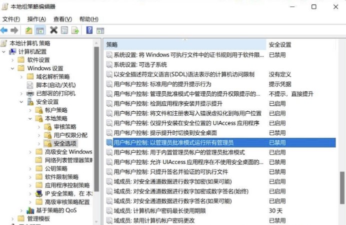 2、打开组策略之后依次展开【计算机配置】→【Windows设置】→【安全设置】→【本地策略】→【安全选项】,在右侧栏找到并双击打开【用户账户控制:以管理员批准模式运行所有管理员】。