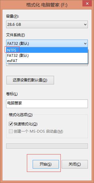 4, 对U盘使用右键,选择格式化。选择NTFS格式,并点击开始。