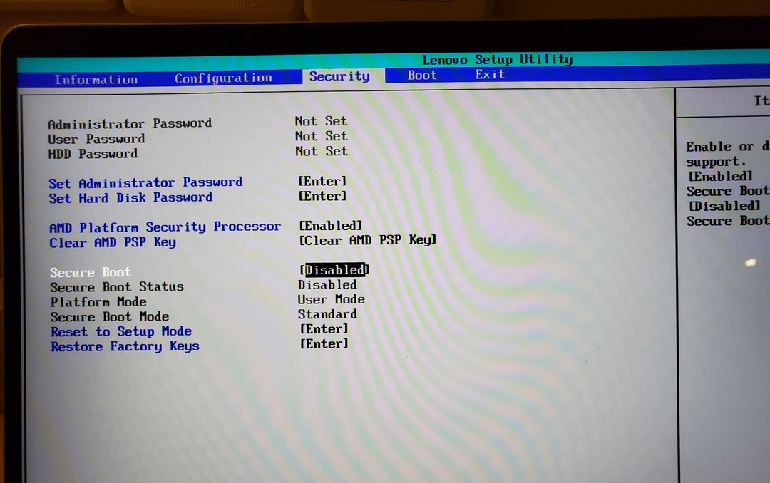 1、首先,依然是在bios界面,将图示的secure Boot选项改为disable,这样才允许对uefi引导进行自定义修改。