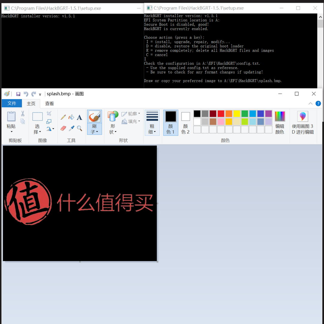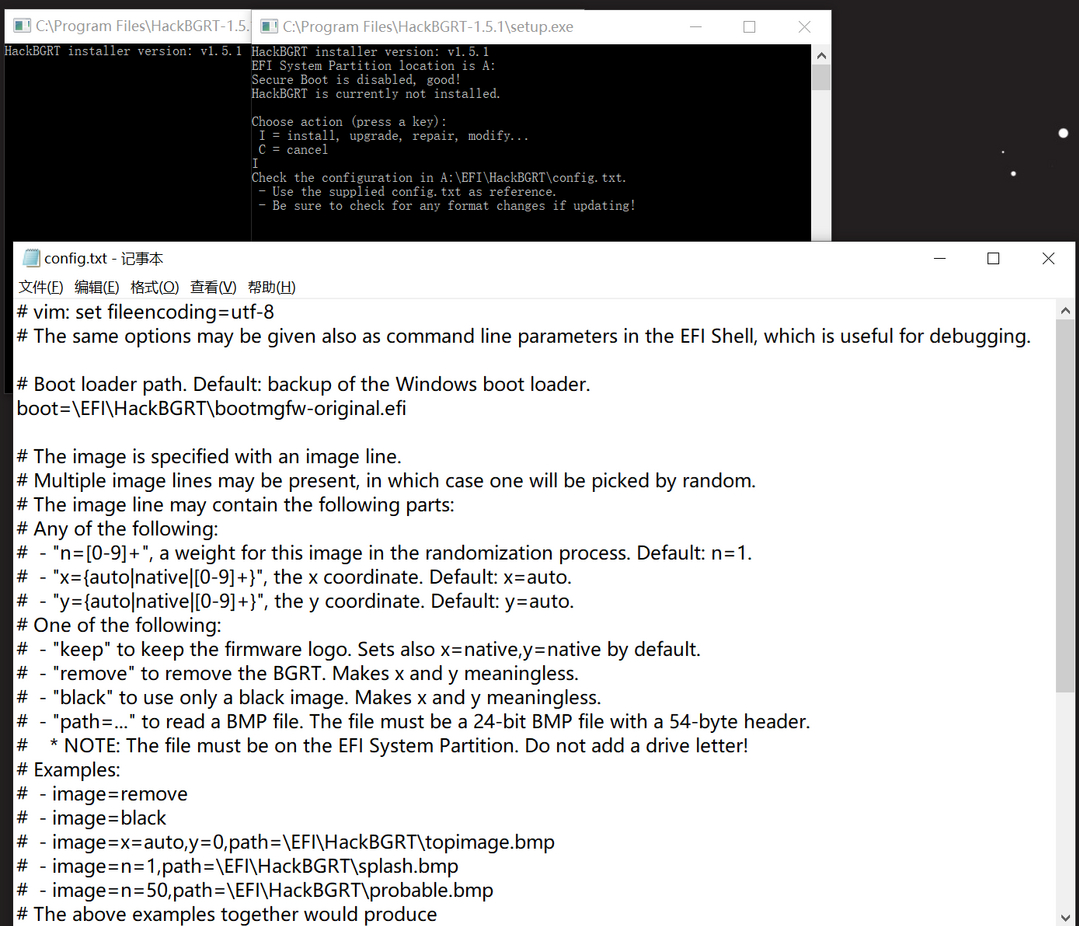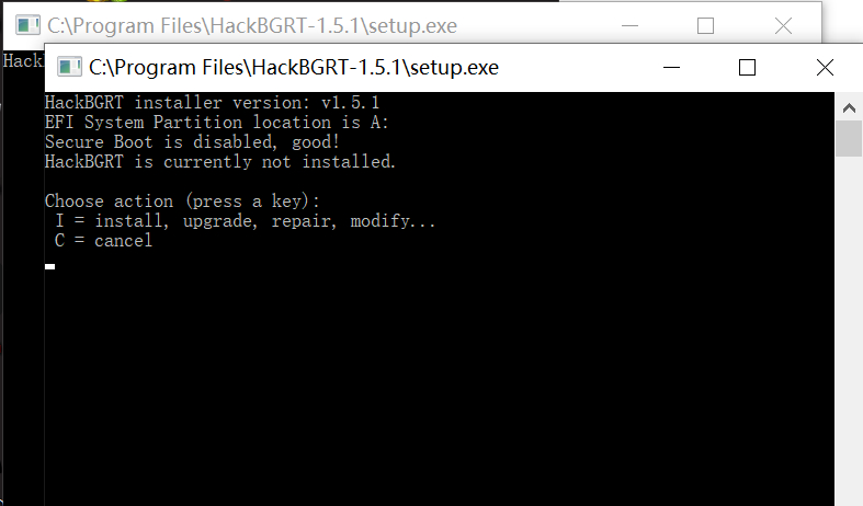 2、下载HackBGRT软件,运行setup.exe,弹出cmd界面,根据提示键盘输入i进行安装;