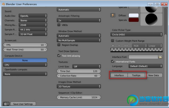 Blender使用教程 1、本站下载三维动画制作软件Blender 2、点击进行安装 3、点击菜单File 》》 User Preferences。 4、在弹出窗口 “Blender User Preferences” 中选 System 选项卡,并依次勾选 International Fonts 、 Interface 和 Tooltips。 常用快捷键 Delete:删除 Ctrl+X:全部删除 Tab:对象模式/编辑模式转换 A:全选或取消全选所有顶点 B:选择界线 G:抓取模式 以上就是当客小编整理的关于三维设计软件Blender中文设置方法教程一览,更多软件教程欢迎关注当客下载站。 |
