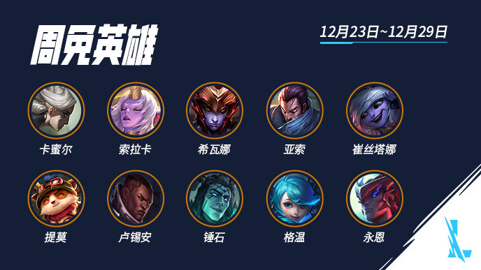 英雄联盟手游12.23-12.29日限免英雄有哪些呢,本周限免英雄已经公布,具体是那几位英雄?以下为大家分享1223-1229英雄联盟手游本周限免英雄介绍。