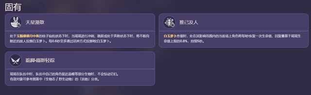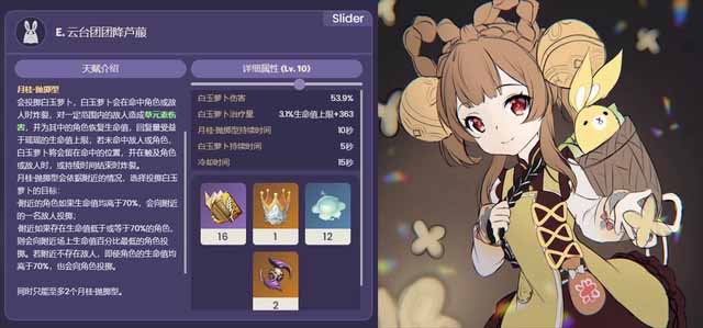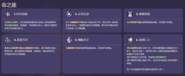 《原神》昨天进行了3.4版本还有海灯节活动的一些预告宣传,为玩家带来了即将到来的版本活动内容还有卡池的角色分布,那么原神3.4版本陪跑四星有哪些呢,接下来一起来看看吧。 3.4up卡池陪跑的是四星草系奶妈瑶瑶 机关投掷白玉萝卜的目标会根据附近的情况选择,分3种情况:1.附近的角色如果生命值都高于70%则投向敌人;2.附近角色生命值低于等于70%时,向百分比最低的角色投掷;3.附近没有敌人,不管角色生命值多少,都会投向角色。机关同时最多只能有两个。 元素爆发“玉颗珊珊月中落”,解放月桂的全部潜能,对敌人造成范围草伤,并进入“桂子仙机”状态。该状态下产生的白玉萝卜将转为依据大招属性造成伤害和治疗,简单来说就是属性更强了,炸裂时还会为全队回血。另外桂子仙机会周期性召唤“月桂·弹跳型”直到上限(3个),目标选择方式和投掷型相同,弹跳型的效果是给瑶瑶加15%移速和50%草元素抗性(固定,不随等级变化)。瑶瑶退场时结束桂子仙机状态。大招耗能80点,持续5秒冷却时间20秒。 固有天赋,“天星漫散”:处于大招的桂子仙机状态时,瑶瑶冲刺、跳跃或奔跑时,将不断向附近的敌人投掷白玉萝卜,每0.6秒最多一枚。“推己及人”,白玉萝卜炸裂时,范围内的场上角色每秒基于瑶瑶生命值上限的0.8%回复一次生命值,持续5秒。生活天赋和早柚同款,接近晶蝶等部分生物时不会惊动它们。 命座效果,1命:白玉萝卜炸裂时,范围内场上角色获得15%草伤加成,并恢复15点体力(5秒一次)。2命:处于大招的桂子仙机状态时,白玉萝卜炸裂伤害命中敌人后,瑶瑶回3点能量,最多0.8秒一次。3命加战技等级5命加大招等级。4命:释放战技或大招,基于瑶瑶生命值的0.3%提升瑶瑶的精通,持续8秒最多获得120点。6命:月桂抛掷型有50%概率投掷超厉害大萝卜,范围更大伤害和治疗量更高,每个抛掷型最多投掷两次超厉害大萝卜。 瑶瑶的技能效果可能只看描述有点复杂,简单来说就是双技能都有治疗。战技是脱手治疗加挂草,大招是要让瑶瑶站场5秒的设计,机关伤害和治疗量更高而且能奶全队,还有能给瑶瑶加移速和草抗的新机关。加移速和抗性是为了什么?因为天赋,大招期间瑶瑶冲刺/奔跑/跳跃都会扔萝卜,5秒持续时间结束瑶瑶就下场。 |