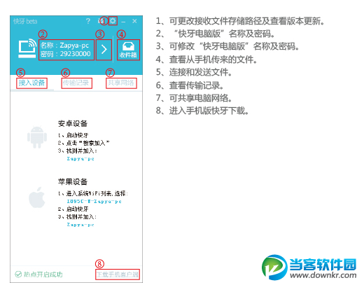 快牙电脑版使用方法教程: 【步骤一】启动“快牙电脑版”自动创建连接 启动后电脑版将自动创建热点等待手机加入连接 【步骤二】手机与“快牙电脑版”连接 1) 安卓系统手机用户加入连接 安卓系统手机用户在开启快牙手机端,可以发现“快牙电脑版”,点击加入连接即可 2) iOS系统手机用户加入连接 iOS系统手机用户首先点开手机设置内“无线局域网”加入“快牙电脑版”创建的热点 然后开启快牙手机端点击“连朋友传文件”按钮即可连接 注:如手机和电脑在同一个局域网,iOS手机可直接开启快牙连接。 |