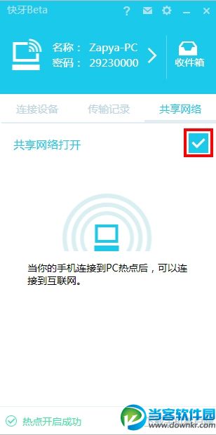 【传输篇】 【电脑向手机传送文件】 快牙手机端加入“快牙电脑版”连接成功后,点击“发送”选择文件即可向手机内传送文件;或者在电脑中拖动文件至快牙电脑版“传文件”按钮处,也可传送文件。 【手机向电脑传送文件】 快牙手机端加入“快牙电脑版”连接成功后,用手机直接选择文件发送即可。 【共享网络篇】 启动“快牙电脑版”后,如果电脑已连接互联网,则“快牙电脑版”将自动分享WiFi信号,供其他设备连接上网,此功能也可手动关闭网络共享。 注:若电脑未插外置WiFi硬件使用“快牙电脑版”,部分外置WiFi硬件驱动可能导致网络共享功能无法正常使用,请删除外置WiFi驱动重启电脑后尝试使用“快牙电脑版”。 以上就是当客小编整理的关于快牙电脑版的使用方法教程,更多软件教程欢迎关注当客下载站。 |
