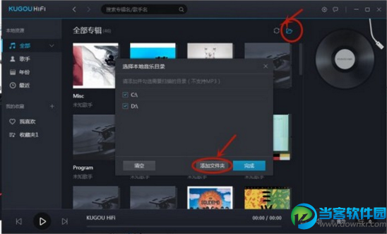 3、如果大家想添加所有盘的东西,可按照箭头所示的方式添加即可。还有一种方式哦,直接把音乐或者装音乐的文件夹拖进界面就可以了