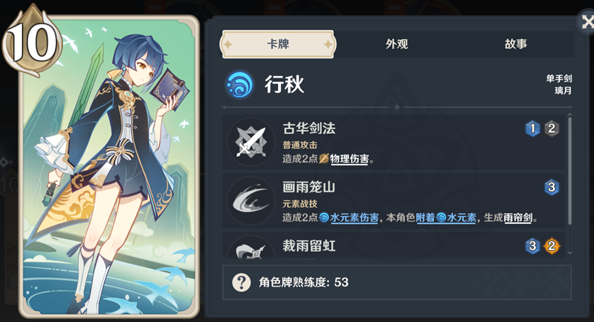 最关键的是,行秋大招只需要2点能量和3个水元素,简直太良心,基本都能在第二回合开始时开出大招。行秋的大招是按次数算,而不是按回合算,也更适合当前版本的主流蓄爆玩法。