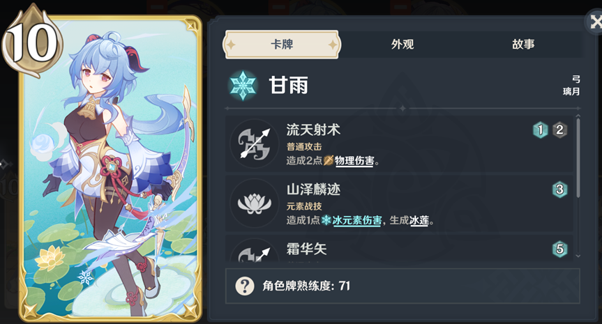 而在普通模式下,甘雨的超导牌组也是主流选手,并且3.4版本更好用了。因为这版本很多人带支援牌大派蒙,在回合开始时生成2个万能元素,这样在普通模式下,甘雨也可以射出霜华矢。