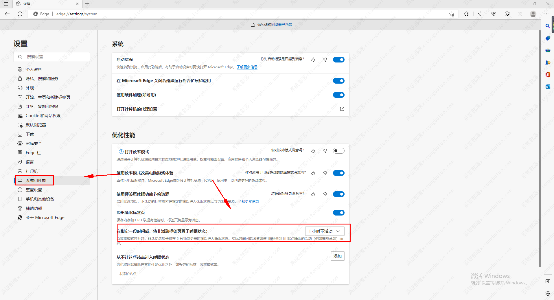 3、然后在设置界面点击“系统与性能”选项,选择非活动标签页置于睡眠状态的时间即可,如图所示。