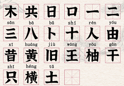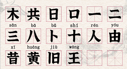 答案:【木、共、日、口、一、二、三、八、卜、十、人、由、昔、黄、旧、王、柚、干、只、横、土】。