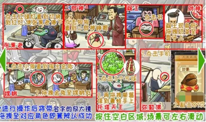 西游梗传第64关怎么通关?不一样的西游历险,玩梗文化,趣味西游解谜,折磨你的脑细胞,关卡卡住怎么办?为你带来西游梗传闹市有仙来答案以及操作方法,助你西游更轻松。 第64关闹市有仙来 【闹市有仙来】这一关需要找出神仙的破绽,辨认出真正的神仙。 1、张果老:点击红绿灯直到切换到红灯,使张果老停下 2、二郎神:点击狗狗直到二郎神睁眼 3、阎王:点击书,阎王现身后拖拽奶茶至盘子上 4、嫦娥:点击小贩直到掏出金兔,拖拽金兔至嫦娥处 5、托塔天王:点击五个气球,再拖拽草莓到青蛙手上 6、弥勒佛:点击手机,敲击81次 7、对神仙进行相应操作,然后拖拽放大镜给露出破绽综的神仙,让其现形。按住空白区域左右滑动,可进行场景的拓展 |