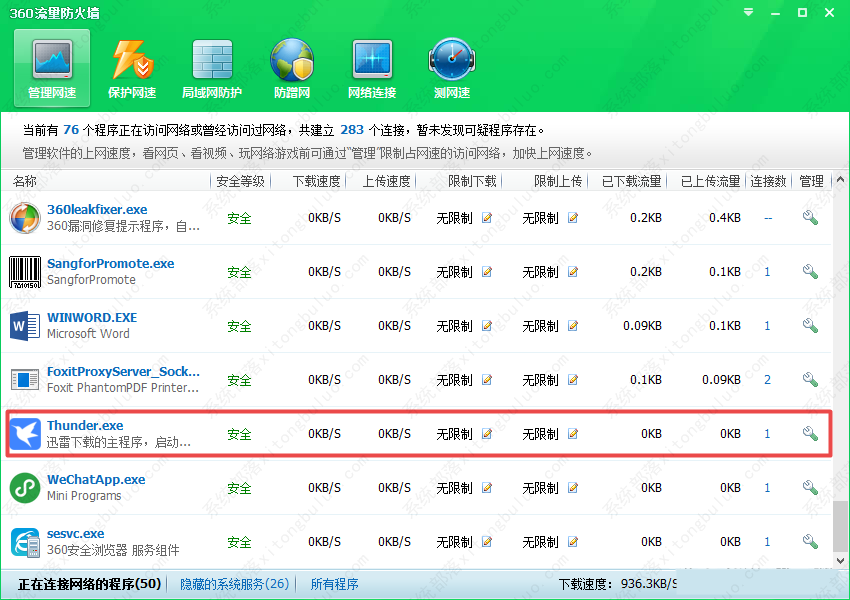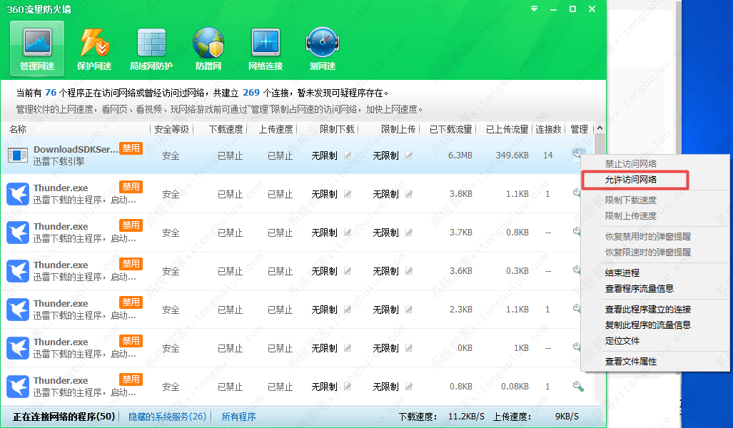 迅雷是一款很好用的下载工具,利用迅雷可以下载任意想要的资源,为了提升下载速度,很多用户都会开通会员,但是成为迅雷会员后发现下载速度一直为0,下载进度一动不动,这是怎么回事?下面小编就给大家带来了四种效果最好的解决办法,希望能帮到大家。 解决迅雷下载速度一直为0的方法一: 出现迅雷下载速度一直为零的情况时,很有可能是个别资源加速较慢,因为服务器资源热度与跨服务器连接的原因导致的。此时,我们再找找其他的下载资源,来看看下载是否正常。 解决迅雷下载速度一直为0的方法二: 出现迅雷下载速度一直为零的情况时,还有可能是因为网络状态出现问题所导致的,此时我们需要检查自己电脑的网络连接是否有问题,查看网络的状态是否处于稳定状态。 解决迅雷下载速度一直为0的方法三: 如果检查网络连接没有问题的话,但是问题还没有得到解决的话,我们还可以尝试切换网络或更换网络来进行尝试下载,看看问题是否得到解决。 解决迅雷下载速度一直为0的方法四: 出现迅雷下载速度一直为零的情况时,还有可能是因为电脑中的杀毒软件所导致的,我们打开杀毒软件,然后找到流量防火墙功能,然后看看迅雷软件是不是设置成了禁止访问网络的状态。 如果是的话,将与迅雷有关的程序设置为【允许访问网络】,然后迅雷下载就正常了。 |