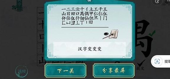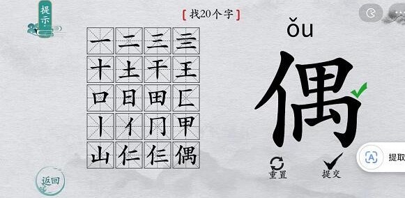 离谱的汉字是一款需要发挥脑筋想象才能顺利过关的汉字解谜游戏,这里面有着超多不同的文字玩法,很多流行汉字梗和流行语等你来挑战。还有偶找20个字这关没过的小伙伴吗?快来看看偶找20个字这关的通关攻略吧! 【偶】找20个字 1、偶字右边是一个禺,禺上面是田字,田字下面加一竖是甲,去掉一竖是日,其中还有口十、王、土、干、工等字,日字加一横是旦。单人旁加王是仼(wáng),加二是仁,加三是仨,加工是仜(hóng) 2、答案依次是: 偶、禺、田、口、甲、日、旦、王、干、土、工、十、一、二、三、亖、丨、冂(jiōng)、匚(fāng)、凵(kǎn)、山、仁、仨、仜(hóng)、仠(gǎn)、仕、仼(wáng)、什、佃、仙、但、丄(shàng)、丅(xià)、旧 |