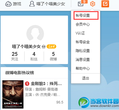 1、打开网页版新浪微博,点击右上角齿轮,点击【账号设置】。