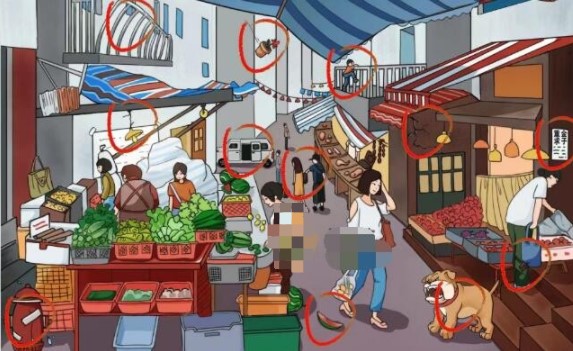 1、疯狂梗传危险菜市场-12处危险是:钱包出逃、烂栏杆、高空抛物、电线破裂、开门面包车、小孩爬栏杆、危房、骗人广告、偷东西、漏水消防栓、西瓜皮、恶犬