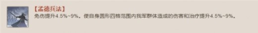 免伤提升4.5%~9%。使自身圆形四格范围内我军群体造成的伤害和治疗提升4.5%~9%。