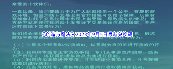 在游戏《创造与魔法》中,玩家们可以体验到沙盒探险、自由交友换装等多种玩法,这些新颖的游戏模式为玩家带来了更丰富的游戏体验。小编为大家整理了创造与魔法2023年9月5日礼包兑换码领取的方法。