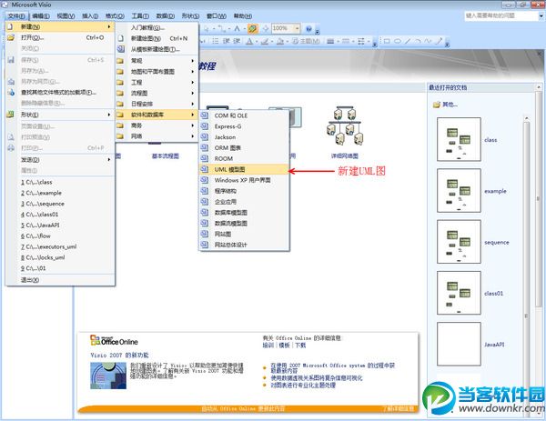 打开“visio 2007”后,点击“文件” -》 “新建” -》 “软件和数据库” -》 “UML模型图”。如下图所示。
