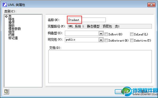第01~03步,新建一个类,打开一个“UML类属性”对话框,并设置类名为Student。如下图所示。
