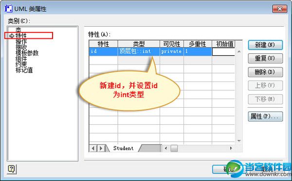 点击对话框的“特性”,并添加Student的属性“id”,设置id的类型是int类型。如下图所示。