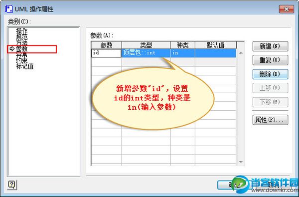 (03) 点击“UML操作属性”对话框,并新增参数“id”,设置id的int类型,种类是in(输入参数)。如下图所示。