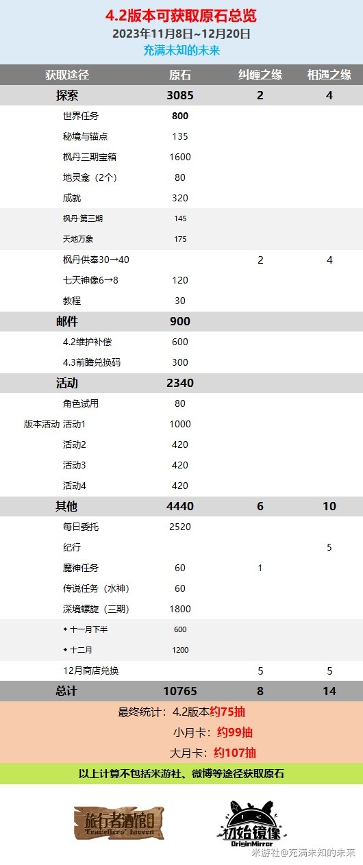 《原神》4.2版本即将更新,新的版本中玩家们可以获取多少原石呢,下面请看“充满未知的未来”带来的《原神》4.2版本原石获取途径一览,希望能够帮助大家。 在4.2版本中,零氪玩家能获得10765原石、8个纠缠之缘、14个相遇之缘,具体结果参考如下: ◆ 零氪:大约75抽 + 14 相遇之缘 ◆ 小月卡:大约99抽 + 14 相遇之缘 ◆ 小月卡+大月卡:约107抽 + 14 相遇之缘 部分原石获取途径说明: 魔神任务:开1幕,按一幕60原石算,同时每一幕完成后,可以在冒险手册里面领取一枚纠缠之缘,所以一共60原石+1纠缠之缘。 供奉系统:按照之前的惯例,枫丹会分为四期开放,除4.0开放20级之外,后续每期仅开放10级,所以本次是30级提升到40级。 成就: ①天地万象按30个隐藏成就计算,主线1幕,每一幕会有4个成就,也就是25原石,所以是175原石。 ②枫丹·第三期:老规矩的仙灵、挑战、宝箱各给35,一共105。地灵龛10,锚点和七天神像分别给5,系列任务按2个算,一共145原石。 地图:本次依旧有新地图,根据目前游戏内的建模比例来看,大概与4.1版本区域大小相当,至于地下有多少就不好说了,本期预估的基本上都按4.1预估来算。 |