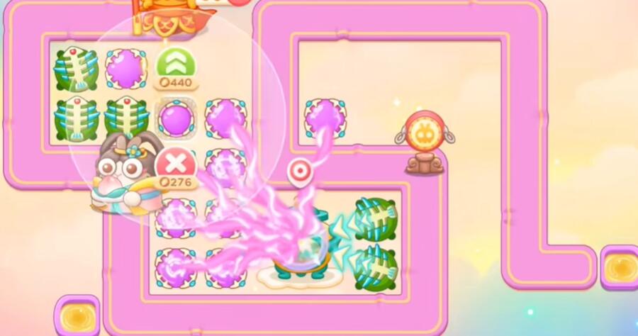 3、继续飞机打钱袋,鱼刺打桃子,魔法球打大钟、钱袋。