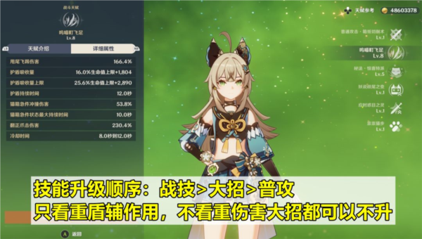 技能升级顺序推荐:战技》大招》普攻。战技对应的是最重要的护盾量,自然要优先升级。大招倍率很高,在部分整活玩法可以炸出不俗的伤害;但在作为盾辅的一般情况下,绮良良并不怎么依赖大招,因此甚至可以只升战技,大招和普攻都不用升。
