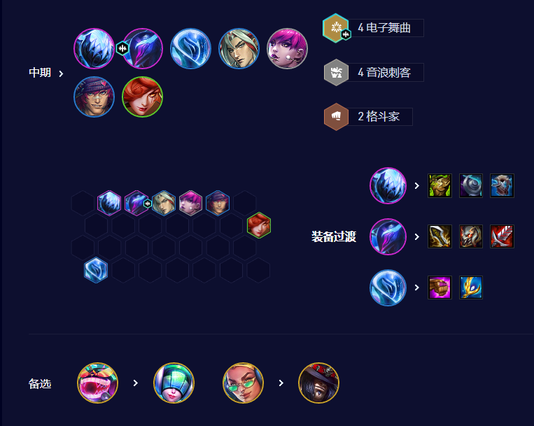 金铲铲之战S10电子火影劫阵容怎么玩?金铲铲之战s10电子火影劫阵容是游戏中目前一个强度还不错的阵容,阵容也比较冷门好成型,可能有玩家还不清楚这个阵容要怎么玩,下面小编就给大家整理了具体的玩法攻略,一起来看看吧! 《金铲铲之战》S10电子火影劫阵容玩法攻略 【电子火影劫】5电子舞曲4音浪刺客2格斗 一般情况下2-1升4,2-5升5,3-2升6,4-1/4-2升7。前期尽量用强势棋子与羁绊打工,保证打工棋子2星,进而稳定血量健康。尽量使用利息升级,步入7与8阶段,7级、8级替换低费打工卡,向以4-5费棋子为核心阵容转型。 一、赛季之星 二、符文分析 音浪刺客是越打越厉害,所以可以多选拖时间的海克斯。 三、装备分析 3超级粉丝配合寡妇的天选可以很平滑的过度到中期。要是前期卡特数量多还可以直接转卡特。 法袍是必备的可以更好过前排,冰甲加快启动可以更好的控制对面。 四、阵容站位 劫与扎克站一起,吃法袍的破甲,可以更好的过前排。拉克丝与对方主c站对角可以更大程度的把对方后排抹杀。劫最好不要与对面主c站同边,劫本身很脆,防止被秒。电子舞曲给劫! 五、搜牌节奏 4-3选完海克斯要是经济好可以直接上8找一个劫天选,如经济不太好就4-5上8大D,大概成型后即可上9找琪亚娜。电子舞曲给劫! 六、克制分析 适合打法师阵容,不太好打前排主c的整容类似于瑞文和铁男。电子舞曲给劫! |