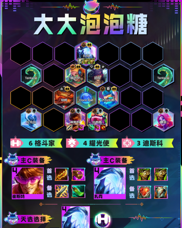 在《金铲铲之战》,最近掀起一阵大大泡泡糖阵容的热潮,备受欢迎且胜率飙升。对于尚未体验过的玩家,或许还不太了解这套战术的精髓。别急,小编即将详细解说大大泡泡糖阵容的过渡策略和运营思路。从构建到成型,小编将一一道来,助你轻松驾驭这套独具特色的阵容,享受游戏中的胜利滋味。跟随小编的引导,让你的《金铲铲之战》旅程更加精彩纷呈! 金铲铲之战大大泡泡糖阵容怎么搭配 1.金铲铲之战大大泡泡糖阵容组成:塔姆、酒桶、瑟提、娜美、拉克丝、扎克、卡牌、吉格斯、俄洛伊 2.阵容羁绊:6格斗家4耀光3迪斯科2电子舞曲1高能流行 3.赛季之星:天选格斗家扎克/俄洛伊 4.阵容站位: 有大到不能倒的扎克带石像鬼石板甲直接单独站在前排 其他格斗家尽量围着迪克斯的灯球围绕站位 卡牌、吉克斯这两个英雄放在最后一排中间 5.装备推荐: (1)主c卡牌:羊刀/青龙刀+电刀+珠光护手 卡牌的装备优先考虑电刀,这是卡牌的核心输出。其次羊刀、青龙刀、红霸服这几个启动装有什么用什么 (2)副c吉格斯:青龙刀/红霸服/法爆 (3)主坦艾克:狂徒铠甲*2+坚定之心/石像鬼石板甲 艾克的装备优先考虑石像鬼石板甲,这个装备是艾克的核心装,其次双狂徒铠甲性价比最高,其次才是狂徒铠甲+坚定之心 6.强化符文: 彩色:新人入队、大师级星探、对冲基金、升级咯、潘朵拉的装备、光明装备等 金色:打气、大到不能倒、治疗法球、投资回报、吾剑听命于您、陨落赠礼、珠光莲花、源计划链路、理想主义、参天巨人的坚决、激昂墓志铭、源计划巨块、了解你的敌人、背水一战等 银色:小巨人、不屈意志、白银棉纱、开摆、酷热打击等 |