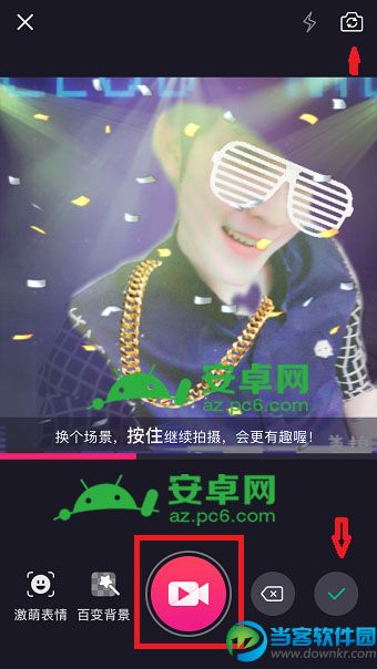 3、在拍摄界面中,按住中间的【拍摄按钮】开始拍摄,在右上角可以切换前后摄像头以及调整闪光灯,拍摄完之后点击右下角的钩就可以了。