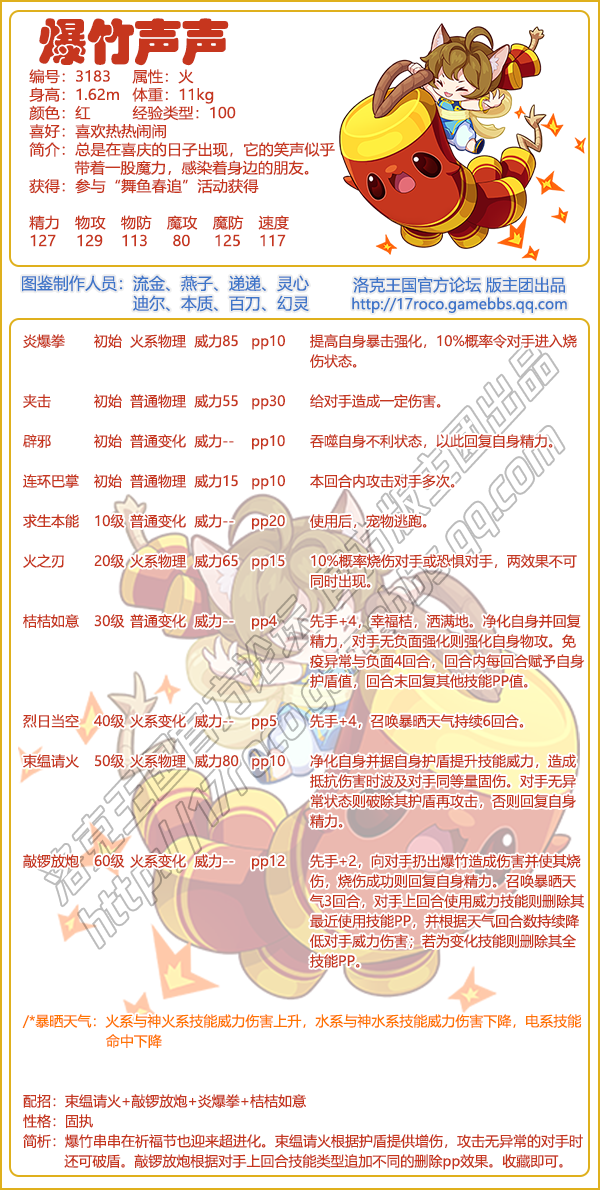 《洛克王国》的爆竹声声技能表和图鉴分享。随着春节的临近,游戏即将推出许多与春节相关的新宠物,其中之一便是爆竹声声,通过参与“舞鱼春追”活动即可获得。下面,小编将分享这个宠物的技能表和种族值,帮助大家迅速了解其各项信息。感兴趣的小伙伴们快来围观吧! 《洛克王国》爆竹声声技能表图鉴: 编号: 3183 属性:火 身高: 1.62m 体重: 11kg 颜色:红 经验类型: 100 喜好:喜欢热热闹闹. 简介:总是在喜庆的日子出现,它的笑声似乎带着一股魔力,感染着身边的朋友。 获得:参与“舞鱼春追”活动获得 配招:束缊请火+敲锣放炮+炎爆拳+桔桔如意 性格:固执 简析:爆竹串串在祈福节也迎来超进化。束缊请火根据护盾提供增伤,攻击无异常的对手时还可破盾。敲锣放炮根据对手.上回合技能类型追加不同的删除pp效果。收藏即可。 |
